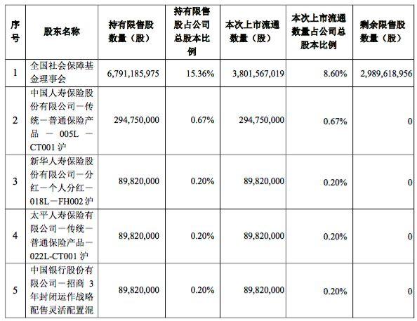 本次限售股解禁,涉及8名股东,包括全国社会保障基金理事会和7家战略投资者。