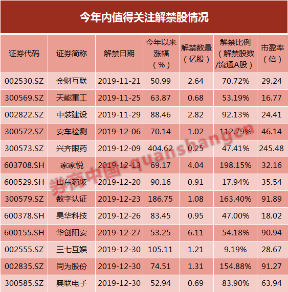 年内还有多只股票将有限售股解禁可以上市流通,重点股票如下。