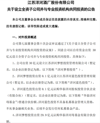 公告显示,经过洋河股份司第七届董事会第十次会议审议通过,同意该公司以自有资金出资30亿元设立全资子公司并与专业投资机构共同投资。