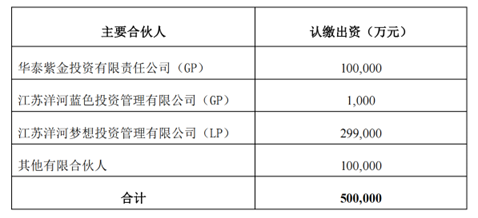 根据公告,华泰洋河母基金的执行事务合伙人为华泰紫金。公司官网显示,华泰紫金是2008年由华泰证券设立的全资子公司,注册资本60亿元,专门从事股权投资业务。基金总规模为50亿元,其中洋河股份共计出资30亿元,华泰紫金出资10亿元,其他有限合伙人出资10亿元。基金存续10年,其中投资期为4年,退出期6年。除了这些合伙人和认缴出资外,该基金不会扩大募集资金规模。