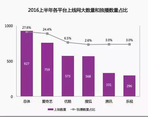 艺恩报告数据显示,2016上半年7家平台(爱奇艺、腾讯、乐视、优酷,土豆、搜狐、芒果TV)共上线927部网大,其中爱奇艺上线759部,即其他4家平台独播数量之和为168部,爱奇艺独播186部,无论数量还是独播比例均最高。