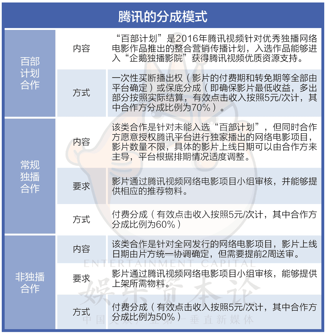 即使没有推出分账系统,依然有很多公司愿意跟腾讯合作,因为财大气粗的腾讯有它自身的吸引力:保底和买断(一次性买断播出权或保底分成)。这也是进入网大市场较晚的腾讯,追赶爱奇艺,获得更多的独家影片,采取的特殊方式。