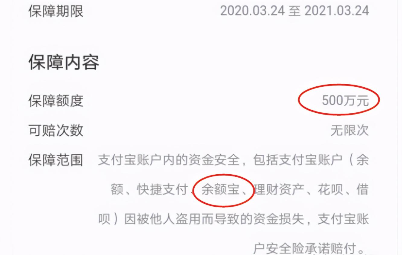 如上图,这是支付宝的保险情况,免费升级保障额度,保障500万元,其中保障支付宝里面的余额、快捷支付、余额宝,花呗等等个人财产。