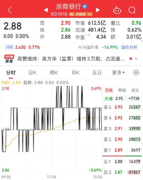 浙商银行A股最新收盘价为2.88元人民币,港股价格为2.63元港币,总市值为613亿元人民币。