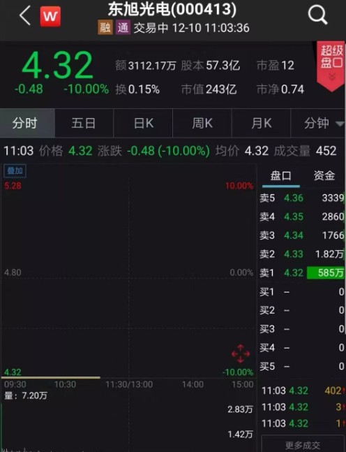 12月10日早盘,东旭光电毫无悬念一字跌停,短短半个小时的时间,抛售资金不断增加,巨量卖盘排队等待卖出。