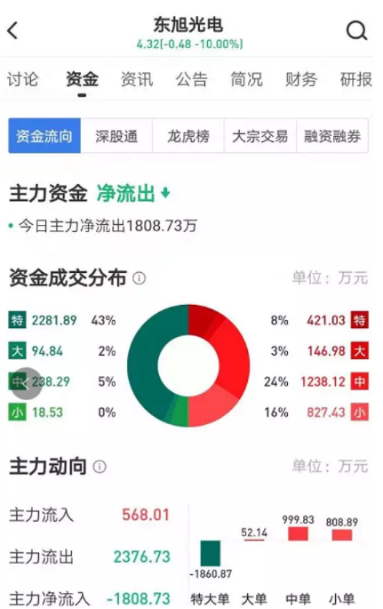 从当日资金流向看,截至当日10点左右,主力净流出资金高达1808万元,其中特大单流出超2281万元,大单94万元,中单238万元。