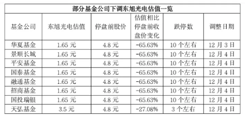 自11月19日起开始停牌的东旭光电,华夏、天弘、招商、平安、国泰、景顺长城、融通、国投瑞银等多家基金公司纷纷发布公告称,对公司旗下基金持有的东旭光电进行估值调整。