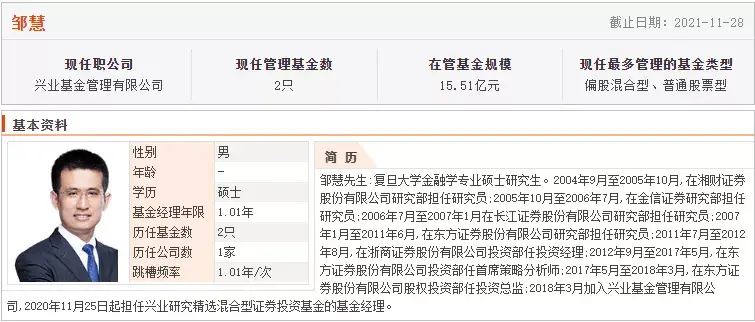 ;2018年3月加入兴业基金管理有限公司,2020年11月25日起担任兴业研究精选混合型证券投资基金的基金经理。