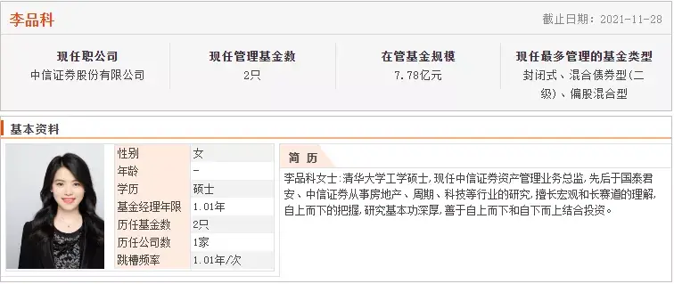 ,先后于国泰君安、中信证券从事房地产、周期、科技等行业的研究,擅长宏观和长赛道的理解,自上而下的把握,研究基本功深厚,善于自上而下和自下而上结合投资。第二次梳理到这位美女了,在管基金2只,在管规模7.78亿元。