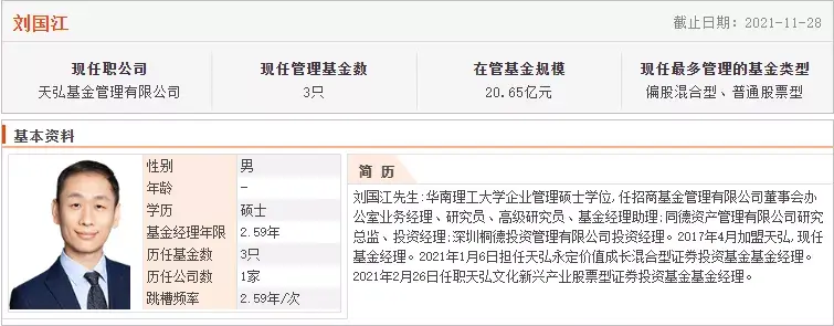 、投资经理;深圳桐德投资管理有限公司投资经理。2017年4月加盟天弘,现任基金经理。2021年1月6日担任天弘永定价值成长混合型证券投资基金基金经理。2021年2月26日任职天弘文化新兴产业股票型证券投资基金基金经理。