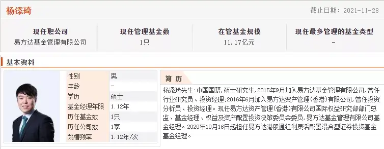 :中国国籍,硕士研究生,2015年9月加入易方达基金管理有限公司,曾任行业研究员、投资经理;2016年6月加入易方达资产管理(香港)有限公司,曾任投资分析员、投资经理。现任易方达资产管理(香港)有限公司