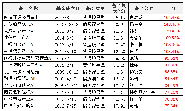 前海开源公用事业161.48%、交银趋势优先148.46%、大成新锐产业139.45%、建信中小盘109.58%、工银物流产业109.39%、金鹰信息产业103.41%