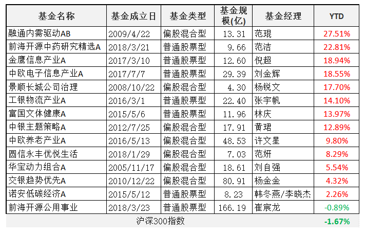 今年以来跑赢沪深300指数的基金一共有14只,其中13只为正收益。