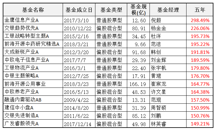 五年累计收益率,金鹰信息产业298.49%、交银趋势优先226.06%、工银战略转型195.73%、前海开源中药研究195.22%、大成新锐产业191.81%,位列前五。