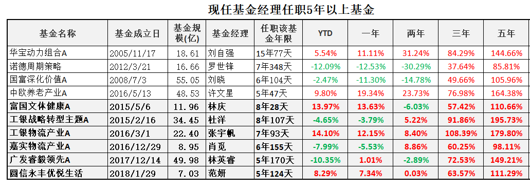 5、现任基金经理任职该基金5年以上的有10只基金,华宝动力组合基金经理刘自强已经任职15年77天,时间最长;任职时间最短的不足半年。