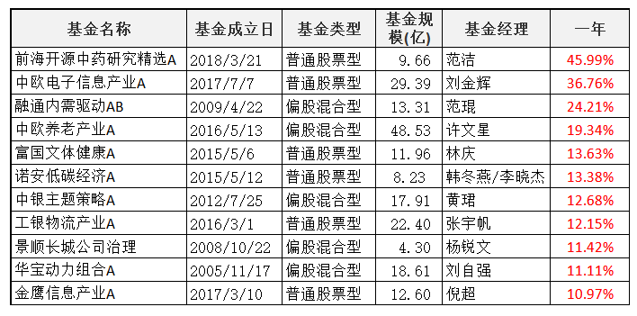 前海开源中药研究、中欧电子信息产业、融通内需驱动分别以45.99%、36.76%、24.21%的收益率位列前三位