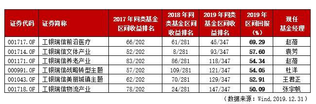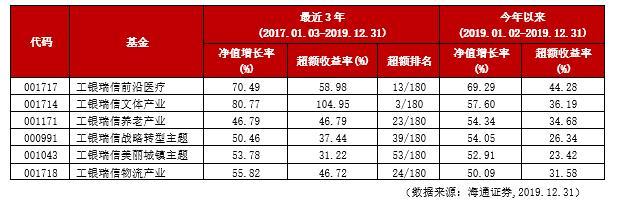 Wind统计显示,工银瑞信旗下工银文体产业、工银前沿医疗、工银物流产业、工银美丽城镇、工银战略转型和工银养老产业这6只股票型基金,在2017年度、2018年度、2019年度的业绩排名均至少位居同类前1/2,在刚刚结束的2019年,均实现了50%以上的投资回报。