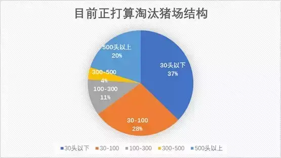 与图2不同,正在考虑是否要淘汰的30头以下母猪场占比为37%,而30-100头母猪场正在考虑的则占到28%,排名第三的是母猪规模在500头以上的,占20%。可以看出,若后期猪价持续下跌,最先淘汰的是100头以下的家庭猪场以及母猪存栏500头以上的规模猪场。而对于母猪100-300头的猪场来说,则是最为坚挺的一部分群体。