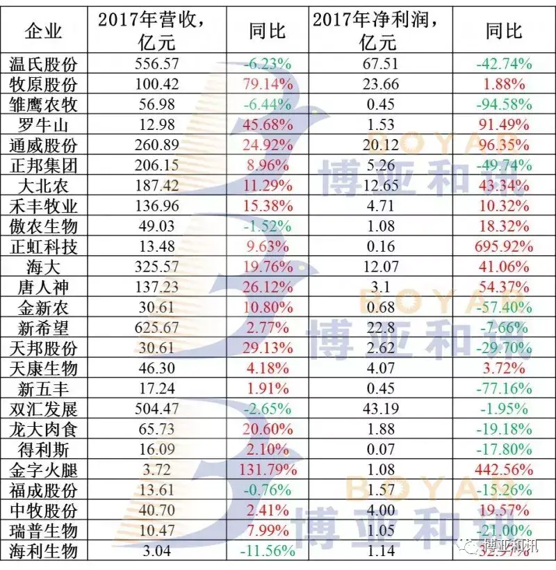 截止到2018年4月底,统计了养猪、饲料、屠宰加工、动保等25家上市企业2017年年度营收与净利数据,2017年猪价下行,畜牧企业营收与净利业绩多出现分化,饲料企业纷纷布局养猪业,业绩受提振作用较大。