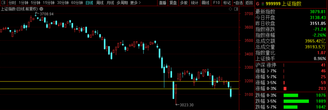 目前的市场,内外交困,无量下行,尤其是今天大盘基本上没有什么挣扎和反抗,直接破位3100点,盘中虽有护盘,但场外资金抄底意愿不强烈,而活跃资金大量被埋,陷入到无人抄底的尴尬境地。