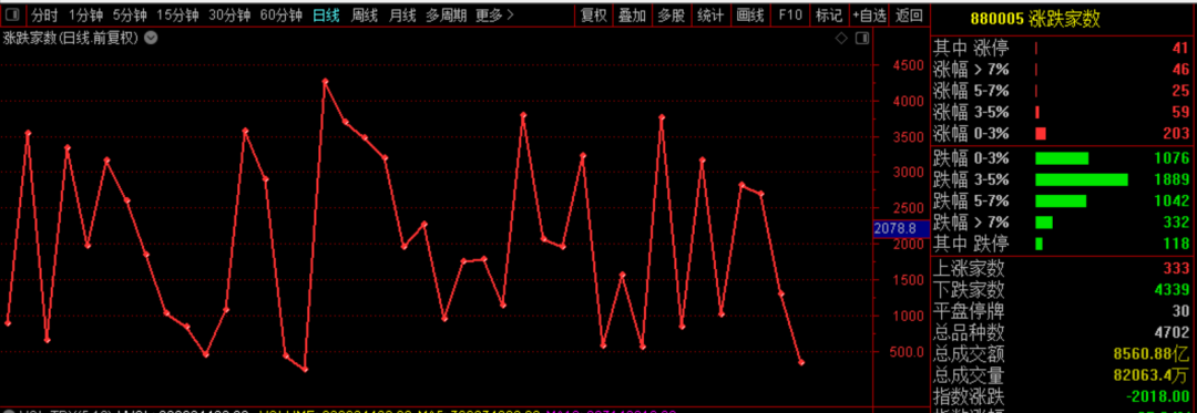 昨天,宁德时代、阳光电源等大盘股带领创业板领跌,但好歹有1200多只个股飘红,今天市场则是普跌,4300多家下跌,只有300多家飘红,跌停个股近百家。