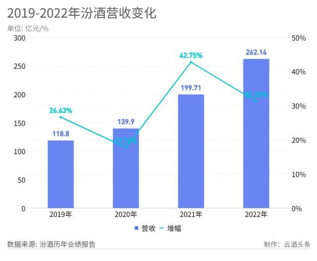 2022年,汾酒一举突破200亿大关,营收262.14亿元。事实上,汾酒的高增长,持续多年。