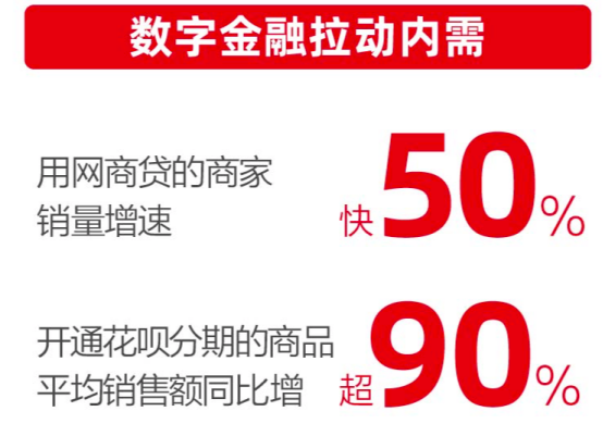 这些数字金融服务让商家直接受益。数据显示,使用了网商贷的商家比没有使用的商家销售增速至少快了50%。天猫双11期间,开通花呗分期的商品,平均销售额同比增长超过90%。