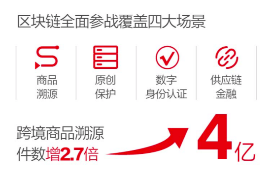 2019年天猫双11,超过4亿件跨境商品添加了区块链“身份证”,比去年多了2.7倍。区块链存证技术首次应用于保护“卖家秀”,500万商品图片版权信息1秒登记在链,有效防止其他平台商家盗用、侵权。区块链技术在供应链金融方面的解决方案,帮助3万天猫双11小微商家获得了供应链贷款。