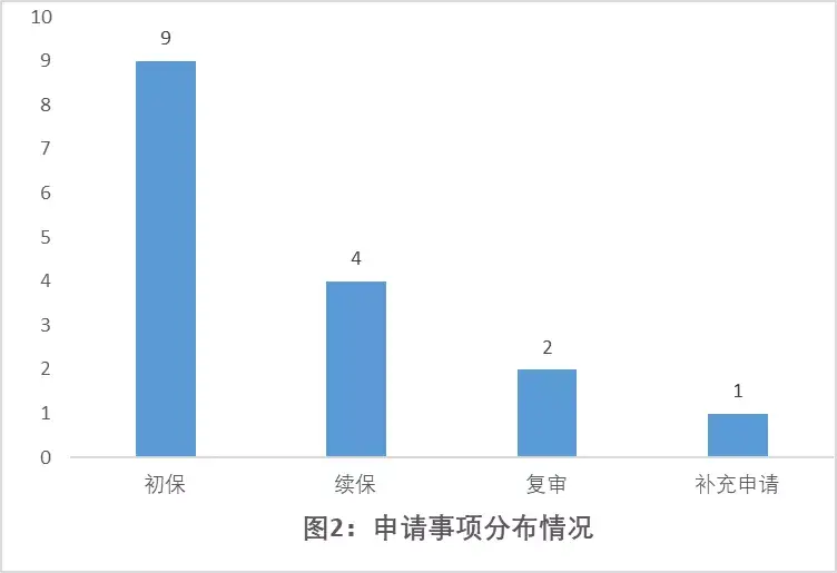 在今年申请中药品种保护的申请事项中,“初保”申请9个,“续保”申请4个,“复审”申请2个,补充申请1个。当前,