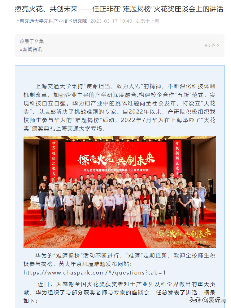 3月17日,上海交通大学发布了文章《擦亮花火、共创未来——任正非在“难题揭榜”花火奖座谈会上的讲话》,披露了华为创始人任正非对天才少年、校企合作等热点话题的看法,并剧透了华为2022年研发投入情况。