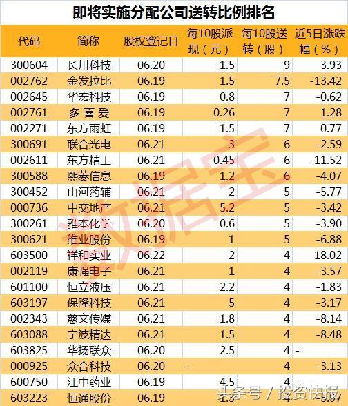 在分红方案密集实施季,上市公司分红有两个比较重要的日期,股权登记日和除权除息日。从送转比例来看,股权登记日为下周的即将实施分红的公司中,送转比例最高的是300604长川科技10转增9派1.5元;其次是002762金发拉比,10股转增7.5股派1.5元;002645华宏科技、002761多喜爱每10股均转增7股。为什么要转增而不是送股?因为转增不用交税,送股散户要交20%个人所得税。