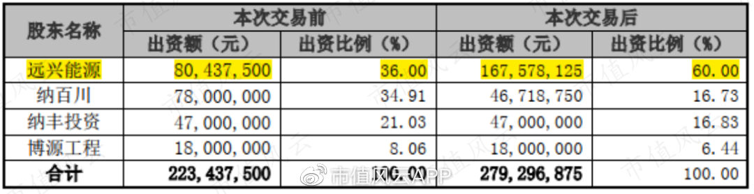 而由于估值很高,远兴能源即使增资51亿,支付进32亿股权转让款,也没拿下多少股权,上文说了,戴老板控制(含重点影响,下同)的相关公司仍持股40%,而投资成本只有1.12亿。