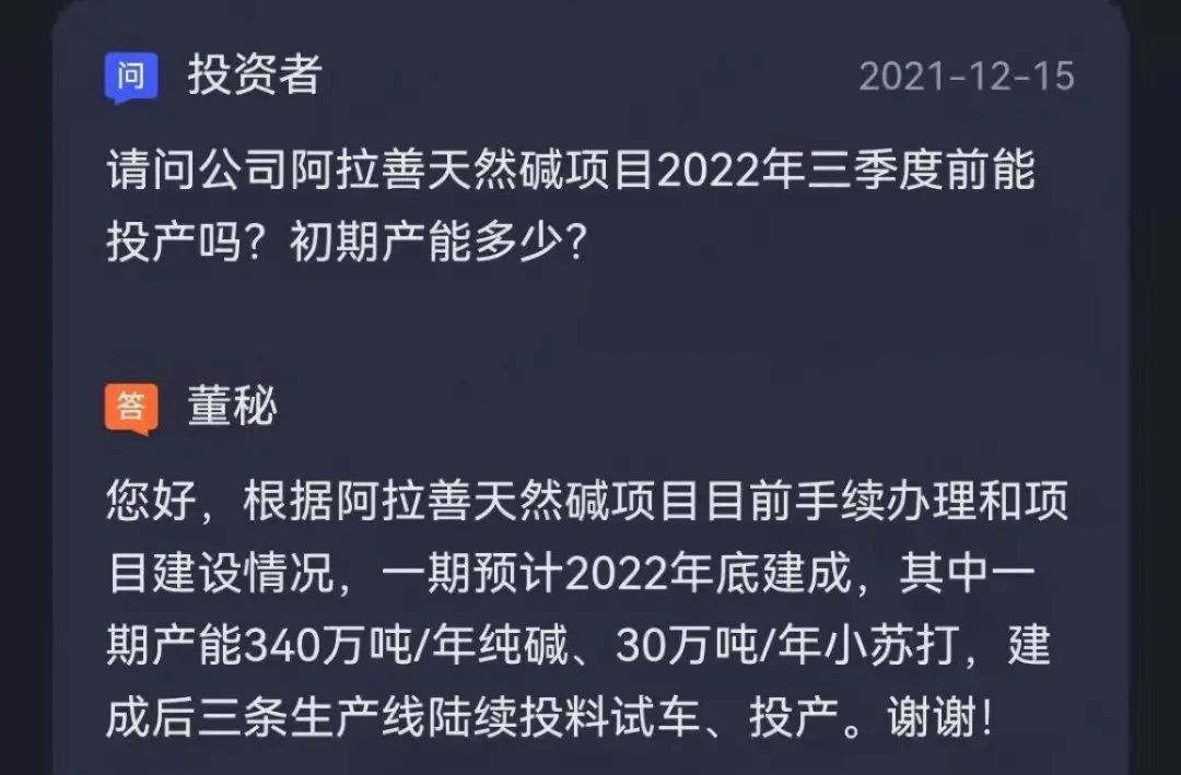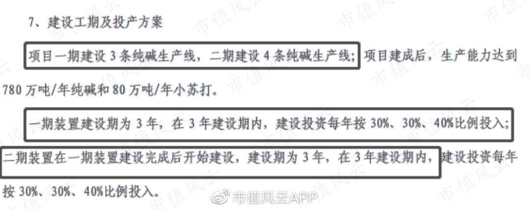董秘是这么说的没错,但是按照远兴能源2021年12月24日公布的《塔木素天然碱矿采矿权评估报告》,该项目一期建设期为3年,二期在一期建设完成后开始,建设期同样为3年。