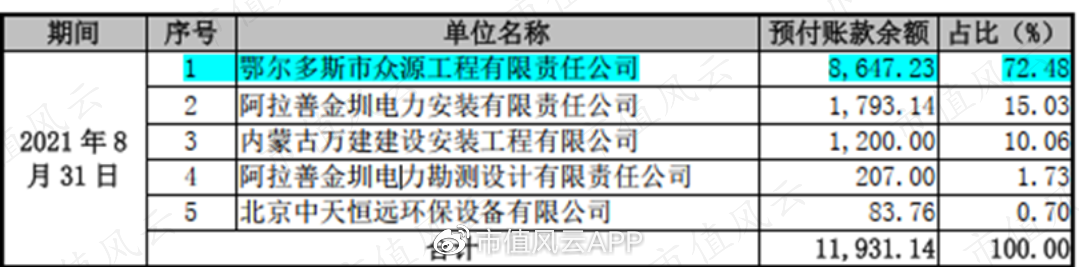 风云君已经在公开数据中找出了答案:截至2021年8月31日,银根矿业已经向鄂尔多斯市众源工程有限责任公司(以下简称“众源工程”)预付了8,647万元的工程款。