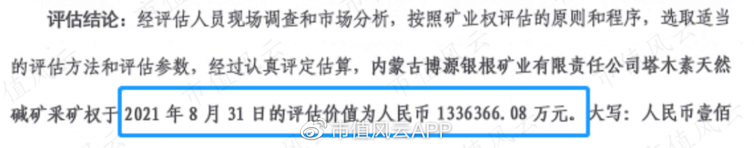 根据山西儒林资产评估事务所有限公司出具的评估报告,以2021年8月31日为评估基准日,银根矿业塔木素天然盐碱的评估值高达134亿元。
