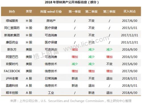 从景林资产2018年的持仓情况看,进入A股和港股上市公司前十大流通股东的个股主要在日常消费、可选消费、医疗保健等行业,美股持仓主要在可选消费、信息技术行业。这与景林资产长期看好及擅长的行业投资保持一致,但是这些领域的优质个股由于在2017年被过度追捧,取得丰厚回报的同时吸引了不少趋势投资者买入,使得这些品种在2018年初估值不低并且交易拥挤,具备回调的空间。所以在2018年市场整体走弱的情况下这些股票出现了较大回撤。下表列出了景林资产2018年持有市值超过2亿元的部分股票,2018年以下11只股票中9只下跌,2只上涨,涨跌幅中位数为-25.71%。从投资操作来看,持股周期长,通常在1年以上,同时,在看好的品种上会逆势加仓。所以这些为景林资产在2017年贡献丰厚业绩的股票在2018年带来了较大回撤。