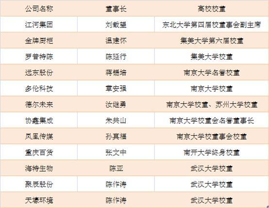 除此之外,21家公司简历关键词特别提及校友,12位家公司董事长担任或曾经担任过高校校董,以南京大学、武汉大学、集美大学人数最多。