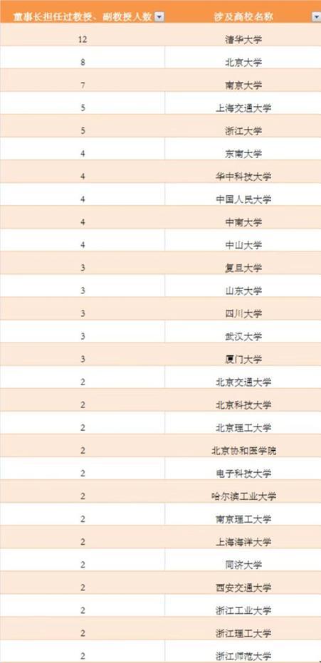 164家公司现任董事长中拥有“教授”,“副教授”背景,主要涉及讲师、客座教授、荣誉副教授、副教授、教授等经历,其中清华大学、北京大学、南京大学、上海交通大学、浙江大学出现频次最高。具体情况如下: