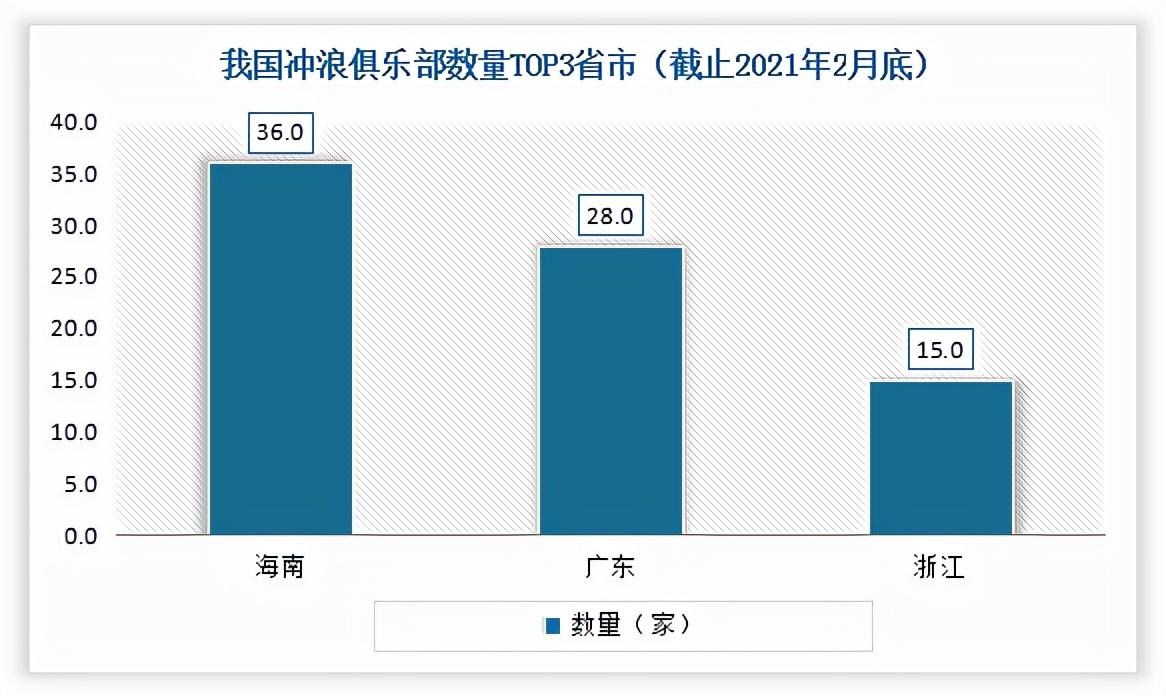 以冲浪为例,近年来随着年轻人成为消费主力军,冲浪运动在国内悄然兴起,2020年国内冲浪人数达30万人次。而随着冲浪运动兴起,冲浪俱乐部数量快速增多。截止2021年2月底,共有来自22个省市的136家冲浪(桨板)俱乐部完成了注册工作,主要分布在沿海地区。其中海南冲浪俱乐部数量最多,达36家,其次是广东和浙江,冲浪俱乐部数量分别为28家、15家。