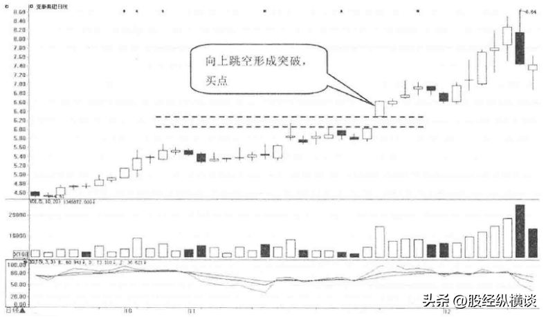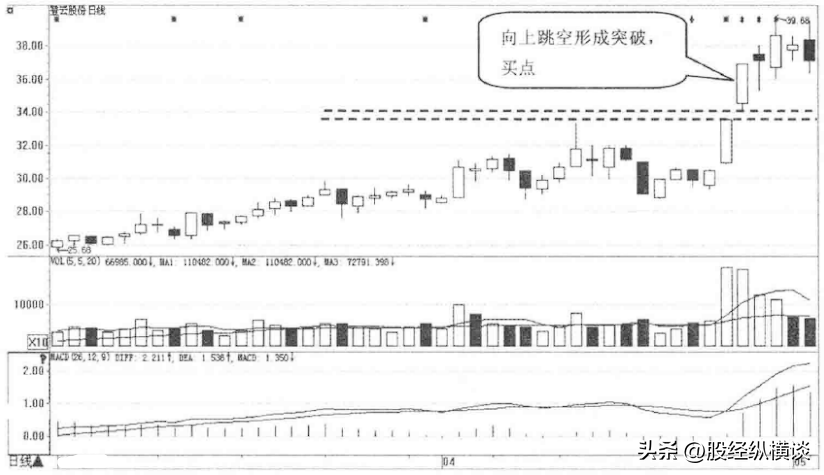 1,向上跳空形成突破如果伴随成交量的明显放大,信号的看涨意义更为强烈。