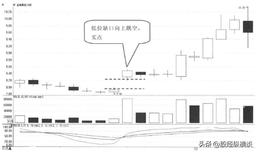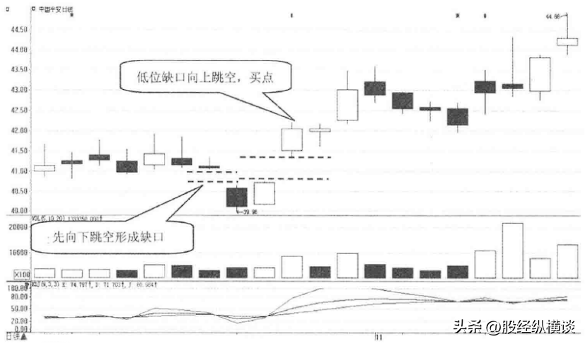1,出现低位缺口向上跳空时,如果伴有成交量的明显放大,则是对这个买点的进一步确认。
