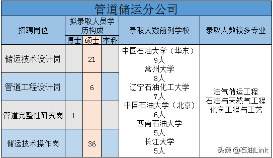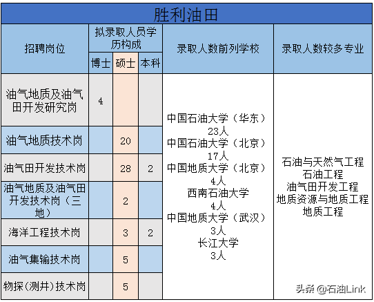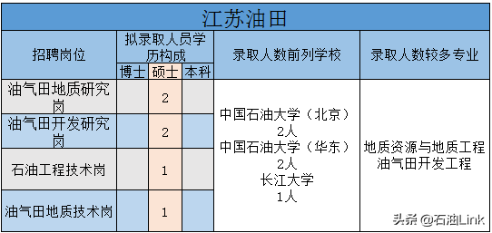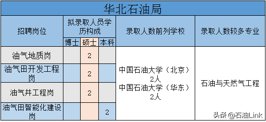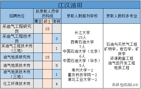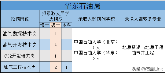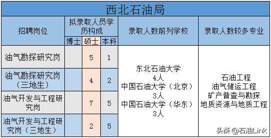在中国石化下属14家油田企业已公布名单中,统计了石油类相关岗位,招聘337人,其中中国石油大学(华东)57人、中国石油大学(北京)56人、长江大学40人,占据人才录取的前三强,紧随其后的是,西南石油大学35人、中国地质大学(北京)15人、常州大学12人,东北石油大学11人。