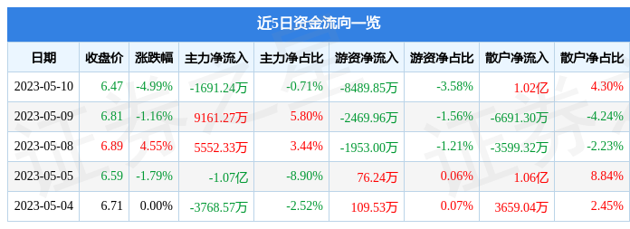 5月10日的资金流向数据方面,主力资金净流出1691.24万元,占总成交额0.71%,游资资金净流出8489.85万元,占总成交额3.58%,散户资金净流入1.02亿元,占总成交额4.3%。