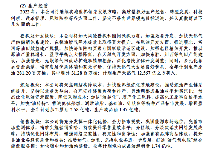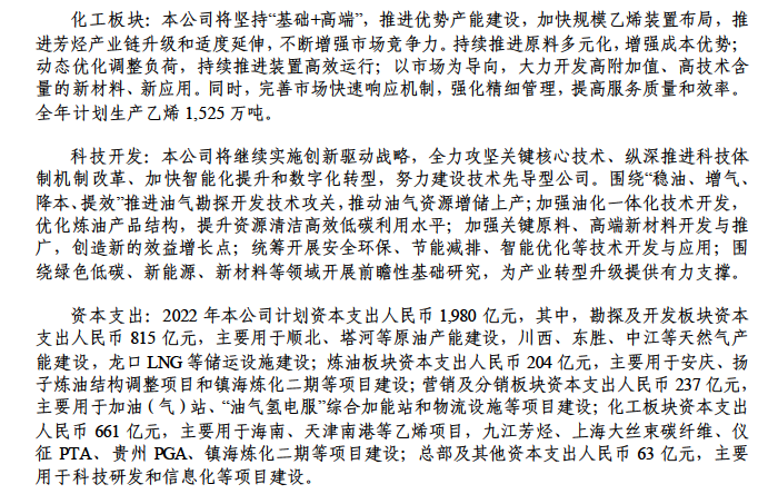 科技开发:本公司将继续实施创新驱动战略,全力攻坚关键核心技术、纵深推进科技体制机制改革、加快智能化提升和数字化转型,努力建设技术先导型公司。围绕“稳油、增气、降本、提效”推进油气勘探开发技术攻关,推动油气资源增储上产;加强油化一体化技术开发,优化炼油产品结构,提升资源清洁高效低碳利用水平;