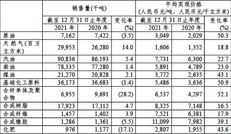 2021年,本公司炼油事业部和营销及分销事业部对外销售石油产品(主要包括成品油及其他精炼石油产品)实现的对外销售收入为人民币15,355亿元(占本公司营业额及其他经营收入的 56.0%),同比增长 30.6%,主要归因于成品油价格上涨,以及需求增加。汽油、柴油及煤油的销售收入为人民币 12,439亿元(占石油产品销售收入的 81.0%),同比增长 28.5%;其他精炼石油产品销售收入人民币 2,916 亿元(占石油产品销售收入的 19.0%),同比增长49.0%。