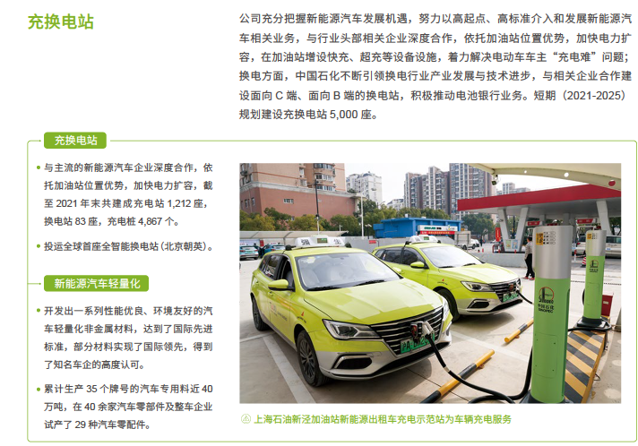 公司充分把握新能源汽车发展机遇,努力以高起点、高标准介入和发展新能源汽车相关业务,与行业头部相关企业深度合作,依托加油站位置优势,加快电力扩容,在加油站增设快充、超充等设备设施,着力解决电动车车主“充电难”问题;换电方面,中国石化不断引领换电行业产业发展与技术进步,与相关企业合作建设面向 C 端、面向 B 端的换电站,积极推动电池银行业务。短期(2021-2025)规划建设充换电站 5,000 座。