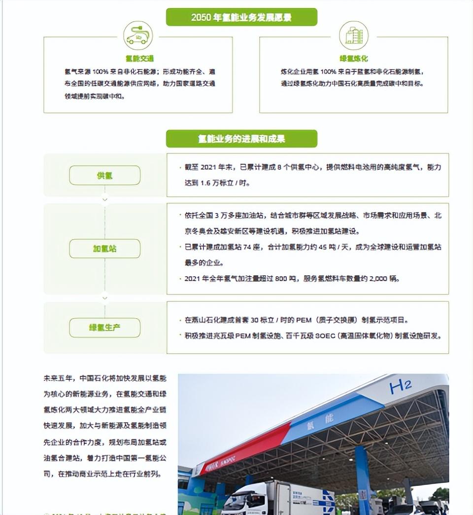 氢气来源100%来自非化石能源;形成功能齐全、遍布全国的低交通能源供应网络,助力国家道路交通领域提前实现碳中和。炼化企业用氢100%来自于蓝氢和非化石能源制氢,通过绿氢炼化助力中国石化高质量完成碳中和目标。