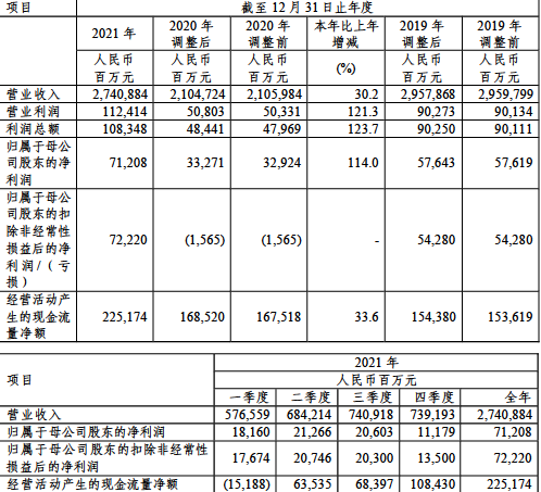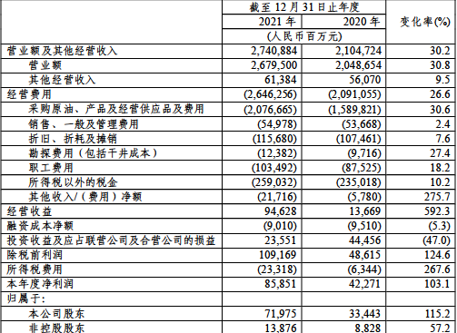 2021年,中国经济持续向好,国际油价震荡上行,境内成品油需求回暖,天然气需求快速增长,化工产品价格上涨。本公司的营业额及其他经营收入为人民币27,409亿元,同比增长 30.2%。本公司抓住市场有利时机,深入开展生产经营优化,推进结构调整和转型升级,实施经营收益人民币 946亿元,同比增长 592.3%。