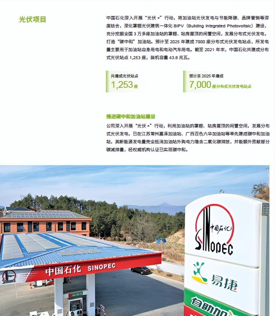 中国石化深入开展“光伏+”行动,将加油站光伏发电与节能降碳、品牌营销等深度结合,深化罩棚光伏建筑一体化 BIPV(Building Integrated Photovoltaic)建设,充分挖掘全国3万多座加油站的罩棚、站房屋顶的闲置空间,发展分布式光伏发电,打造“碳中和”加油站。预计至2025年建成7000座分布式光伏发电站点,所发电量主要用于加油站自身用电和电动汽车用电。截至2021 年末,中国石化共建成分布式光伏站点 1,253 座,装机容量 43.8 兆瓦。