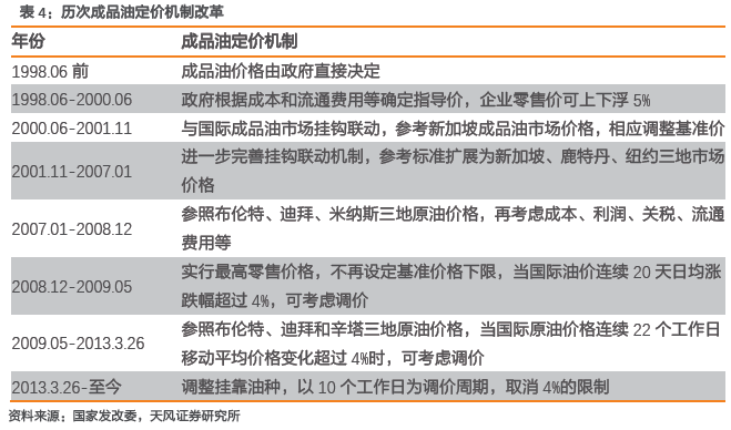 1) 成品油定价机制:我国的成品油定价机制从最早期的发改委直接定价,逐步调整为跟随国际原油市场的挂钩联动机制。最新调整的关键节点是2013 年,调整为10 个工作日调价周期。此后按该规则执行。